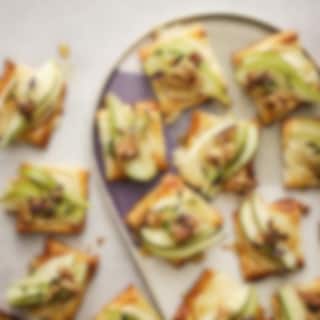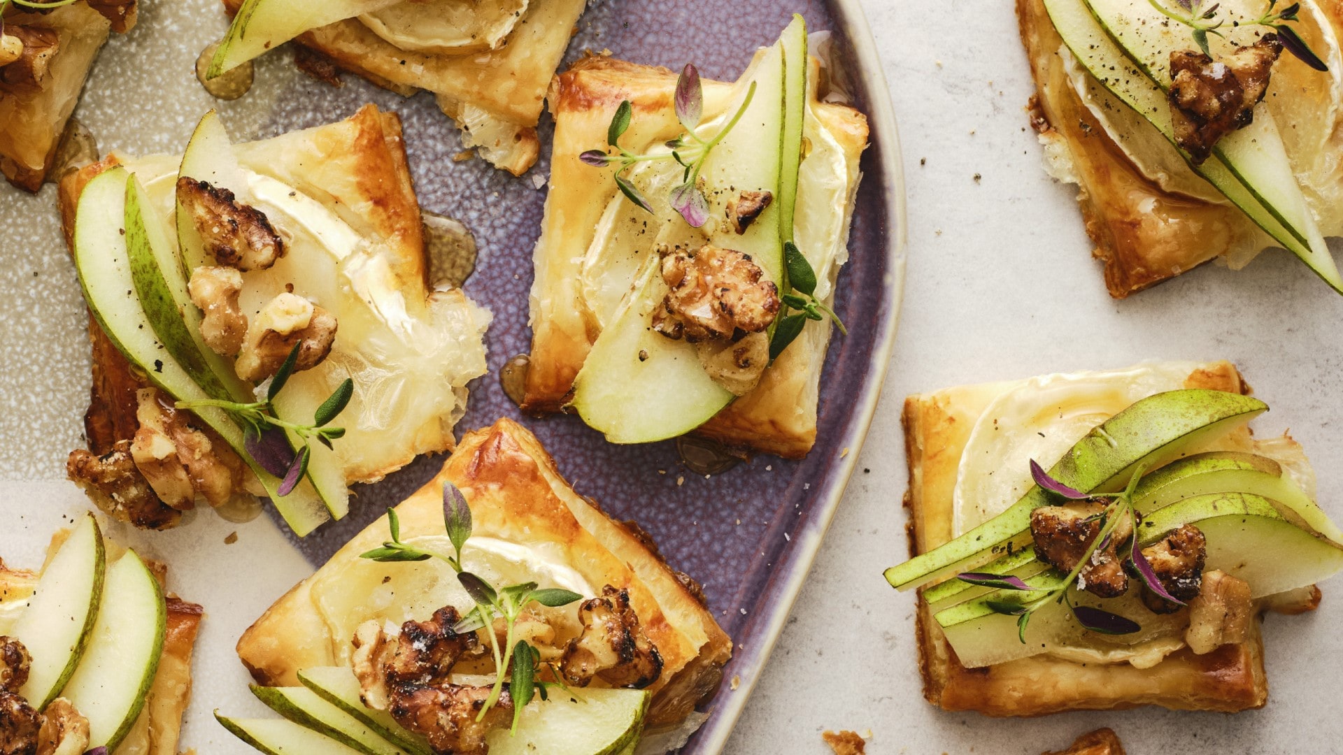 9. Skiva päronet tunt, lägg några skivor på smördegssnittarna
